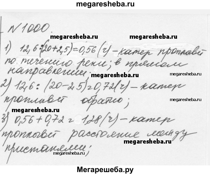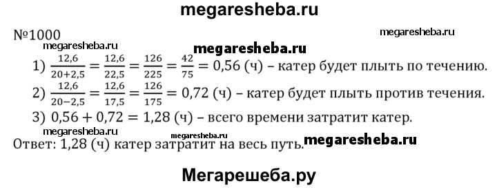1000. Скорость течения реки 2,5 км/ч. За сколько часов катер, имеющий собственную скорость 20 км/ч, проплывёт расстояние между пристанями 12,6 км туда и обратно?