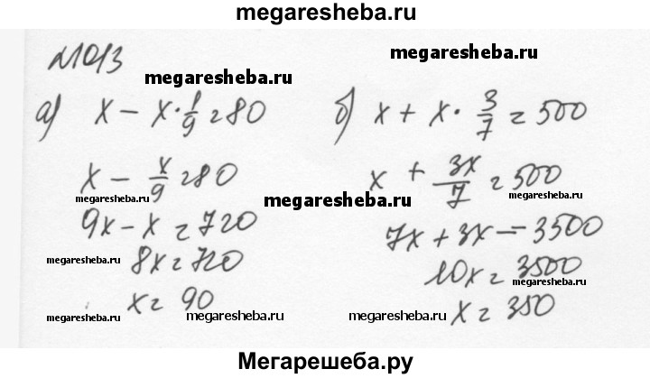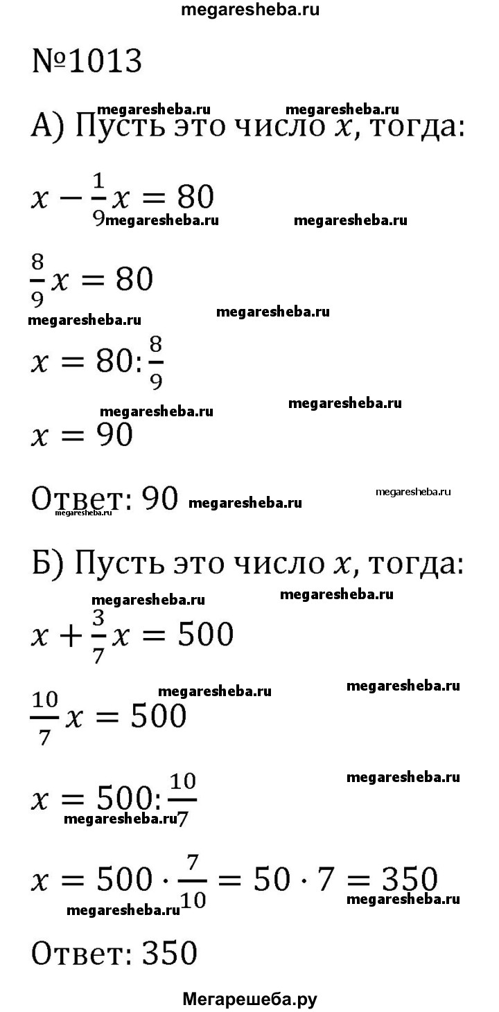 1013. а) Число уменьшили на 1/9 этого числа и получили 80. Найдите число. б) Число увеличили на 3/7 этого числа и получили 500. Найдите число.