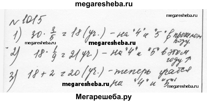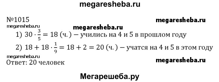 1015. В нашем классе 30 учащихся. В прошлом году 3/5 класса учились на «4» и «5». В этом году число ребят, которые учатся на «4» и «5», увеличилось на 1/9. Сколько ребят теперь учатся на «4» и «5»?