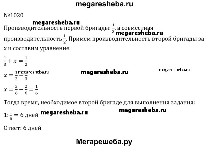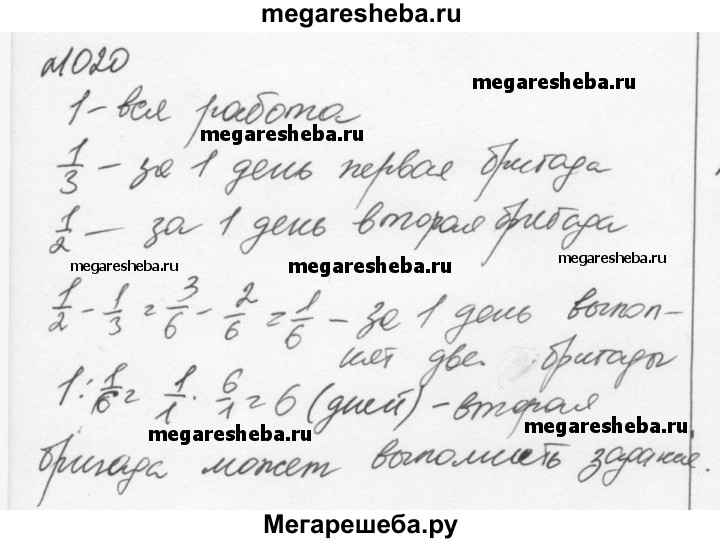 1020. Первая бригада, работая отдельно, может выполнить задание за 3 дня, а вместе со второй бригадой — за 2 дня. За сколько дней вторая бригада может выполнить то же задание, работая отдельно?