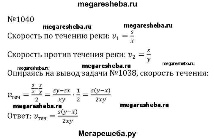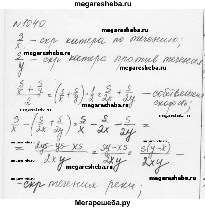 1040. Катер прошёл s км по течению реки за х ч, а против течения — за у ч. Какова скорость течения реки??
