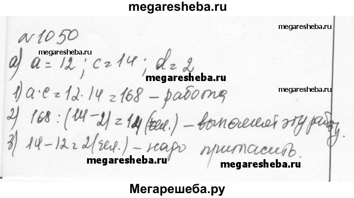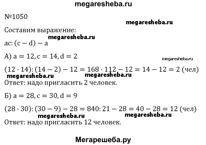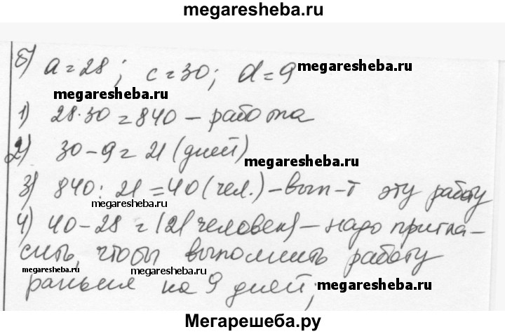 1050. Некоторую работу а человек могут выполнить за с дней. Сколько человек ещё надо пригласить, чтобы выполнить эту работу на d дней раньше, если: а) а = 12, с = 14, d = 2; б) а = 28, с = 30, d = 9?