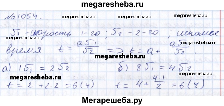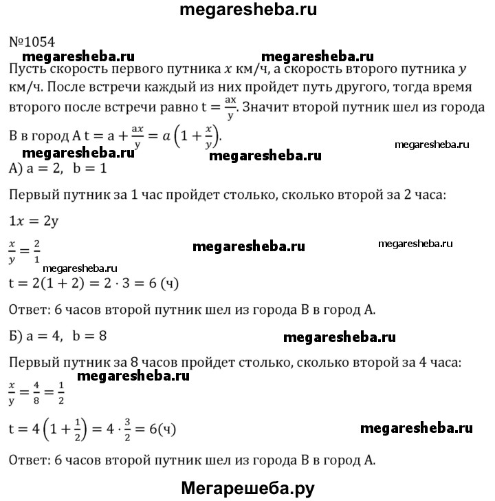 1054. Два путника вышли одновременно навстречу друг другу из городов А и В и встретились через а часов. Ещё через Ъ часов первый пришёл в город В. Сколько времени второй путник шёл из города В в город А, если: а) а = 2, b = 1; б) а = 4, b = 8?