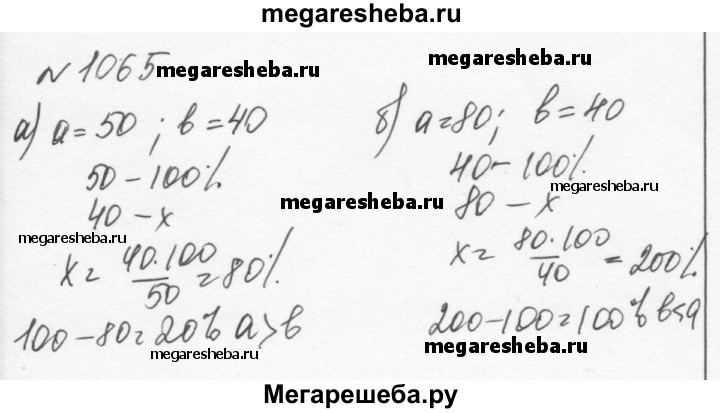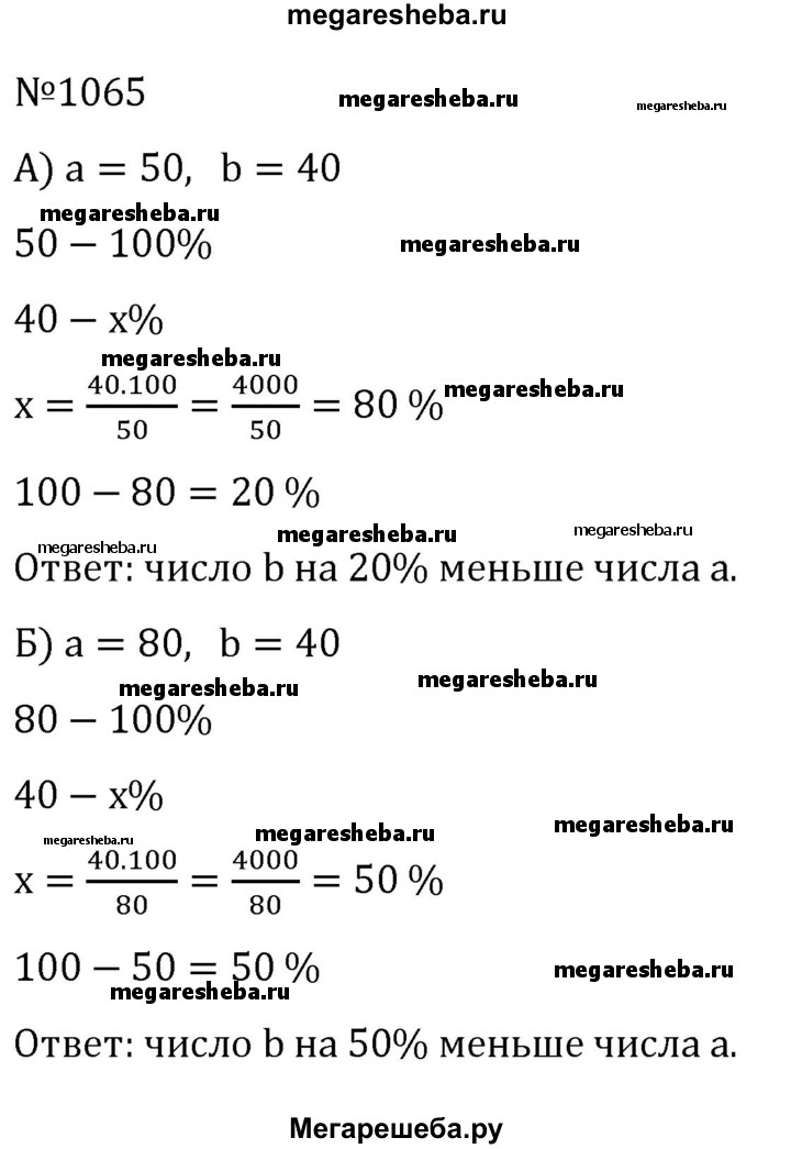 1065. На сколько процентов число b меньше числа а, если: a) а = 50, b = 40; б) а = 80, b = 40?