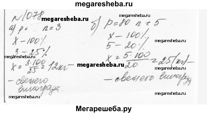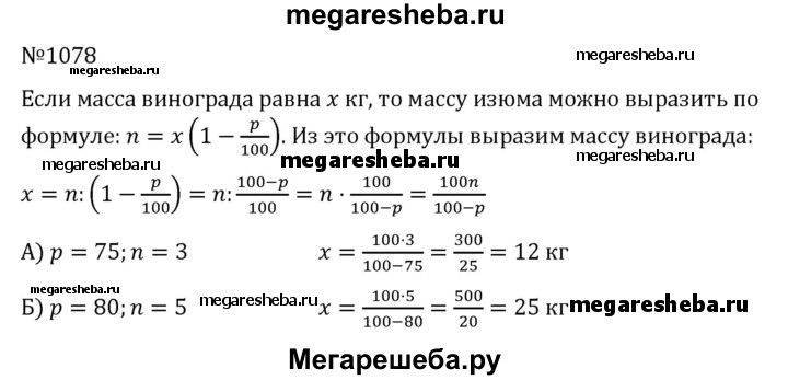 1078. Виноград при сушке теряет р% своей массы. Сколько свежего винограда нужно взять, чтобы получить n кг изюма (сушёного винограда), если: а) р = 75, n= 3; б) р = 80, n= 5?