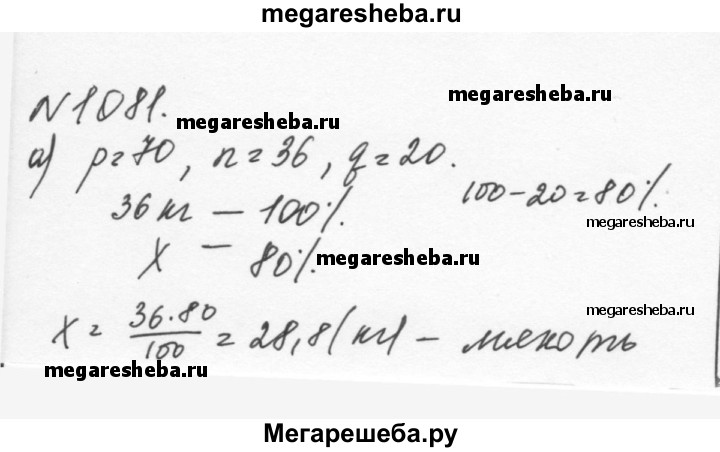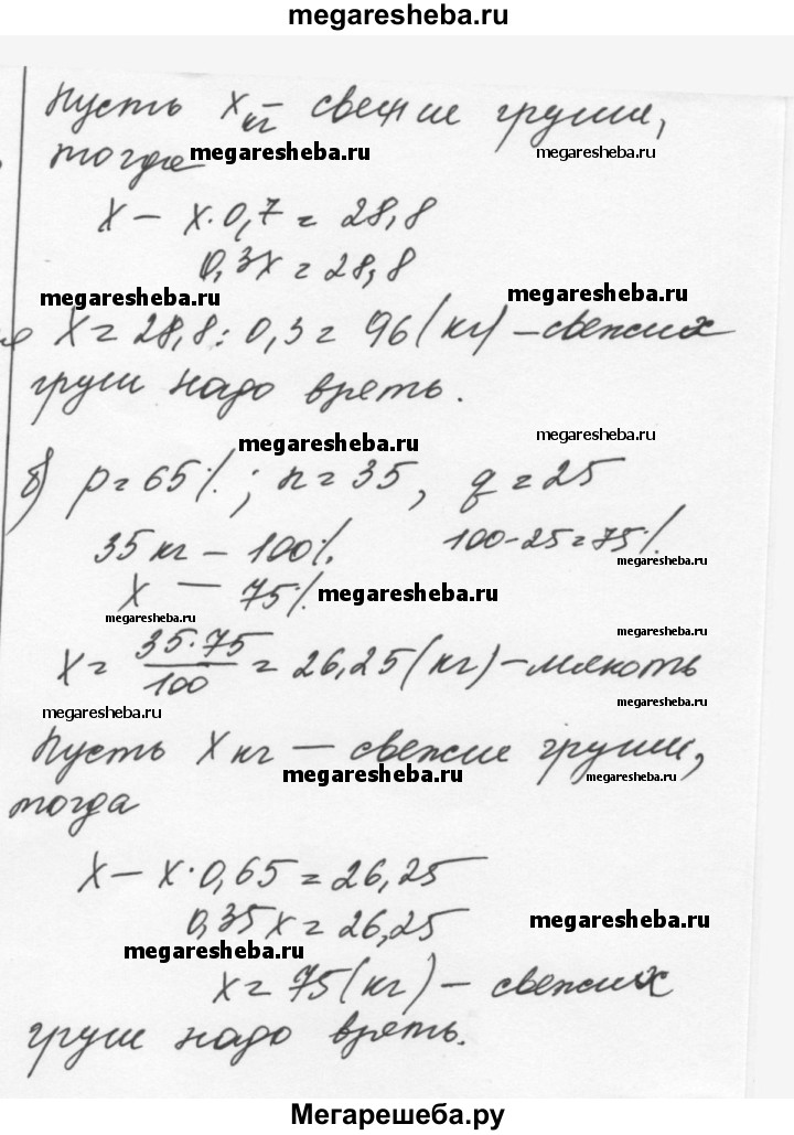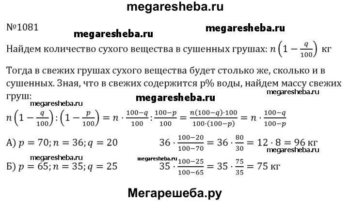 1081. Груши содержат р% воды, после сушки они содержат q% воды. Сколько свежих груш надо взять для получения n кг сушёных, если: а) р = 70, n = 36, q = 20; б) р = 65, n = 35, q = 25?