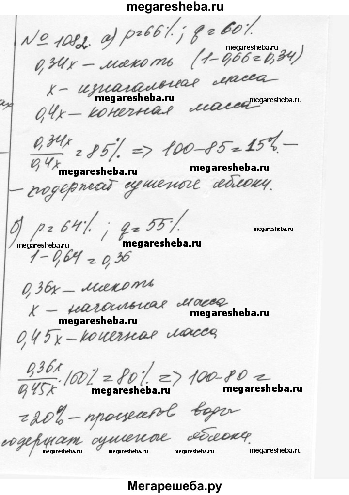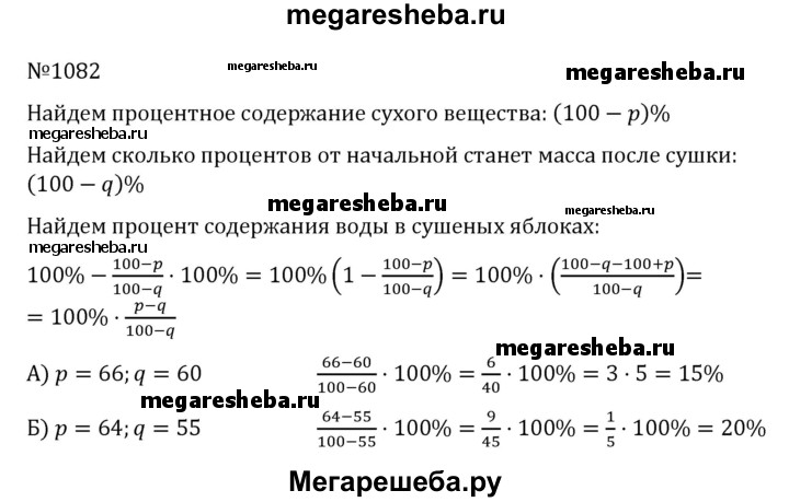 1082. Яблоки, содержащие р% воды, при сушке потеряли q% своей массы. Сколько процентов воды содержат сушёные яблоки, если: а) р = 66, q = 60; б) р = 64, q = 55?