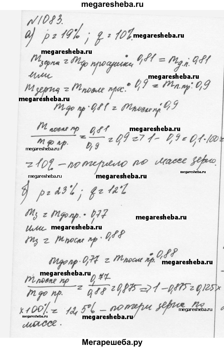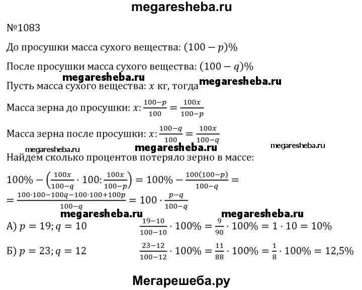 1083. До просушки влажность зерна составляла р%, а после просушки составила q%. Сколько процентов потеряло зерно в массе, если: а) р= 19, q =10; б) р = 23, q = 12?