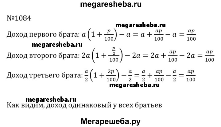 1084. Три брата поместили разные суммы на вклад в банке. Первый поместил а р. под р% годовых, второй — 2а р. под p/2 %годовых, третий — a/2 р. под 2р% годовых. Докажите, что через год доходы братьев от вложения денег будут одинаковые.