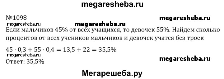 1098. Мальчики составляют 45% всех учащихся в школе. Известно, что 30% всех мальчиков и 40% всех девочек учатся без троек. Сколько процентов всех учащихся школы учатся без троек?