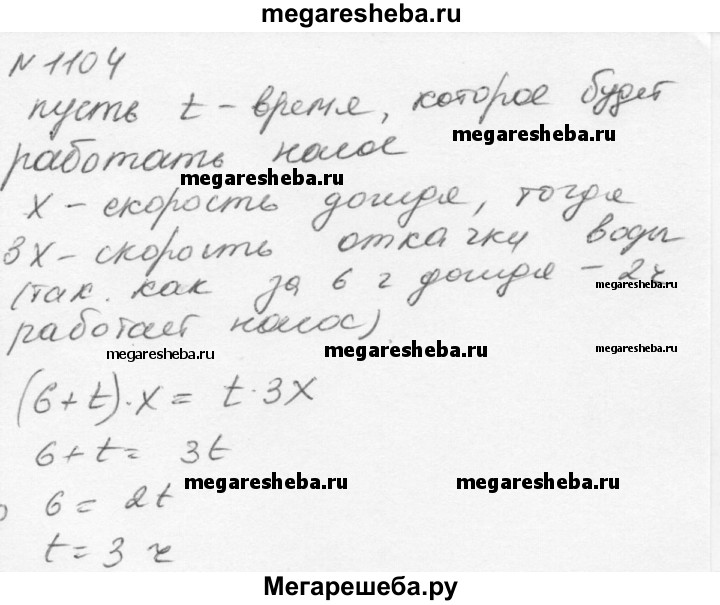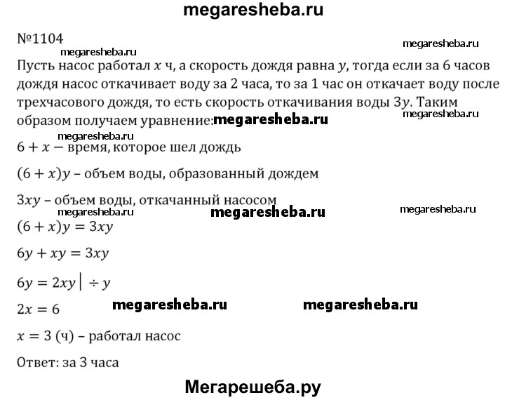 1104. Проливной дождь лил 6 ч подряд и наполнил некоторую часть открытого бассейна. Если бы дождь прекратился, то насос откачал бы воду за 2 ч. Определите, за сколько часов насос откачает воду из бассейна, если дождь продолжает лить. Считайте процессы наполнения бассейна и откачки воды равномерными.