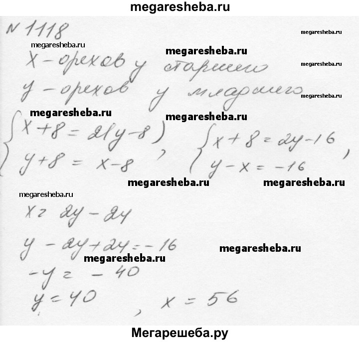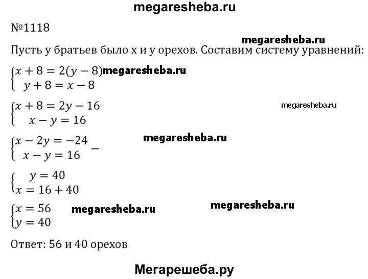 1118. Старший брат сказал младшему: «Дай мне 8 орехов, тогда у меня орехов будет вдвое больше, чем у тебя». А младший брат сказал старшему: «Ты дай мне 8 орехов, тогда у нас будет поровну». Сколько орехов у каждого?
