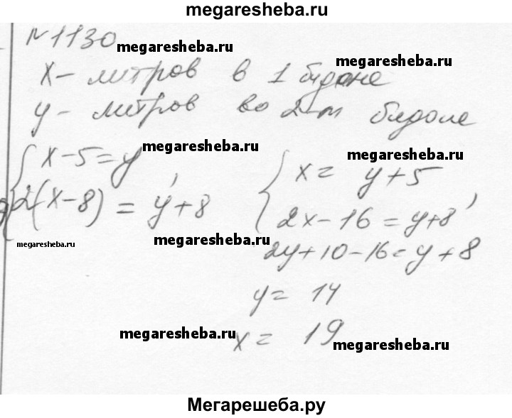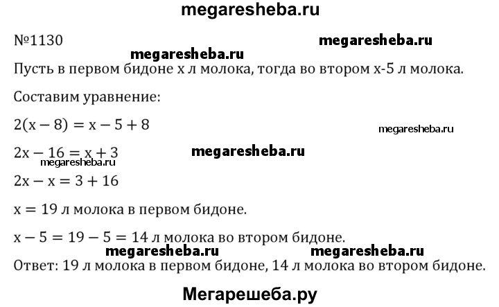 1130. В одном бидоне на 5 л молока больше, чем в другом. Если из первого бидона перелить во второй 8 л, то во втором бидоне станет в два раза больше молока, чем останется в первом. Сколько литров молока в каждом бидоне?