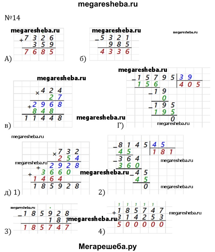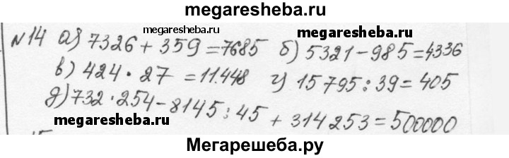 14. Вычислите (14—15): а) 7326 + 359; б) 5321 - 985; в) 424 * 27; г) 15 795 : 39; д) 732 * 254 - 8145 : 45 + 314 253.