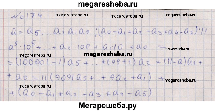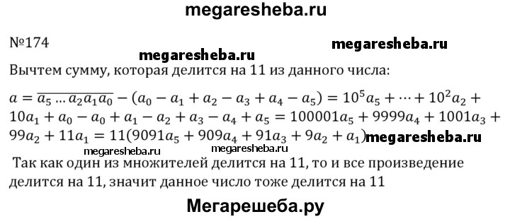 174. Докажите признак делимости: число а = а5...а2а1а0 делится на 11, если сумма а0 — а1 + а2 — а3 + а4 — а5 делится на 11.