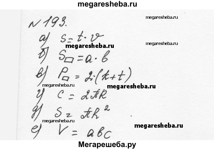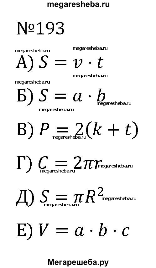 193. Напишите алгебраическое выражение, с помощью которого вычисляется: а) путь при равномерном движении, если скорость движущегося тела и, время движения t; б) площадь прямоугольника длины а, ширины b; в) периметр прямоугольника длины k, ширины t; г) длина окружности радиуса r; д) площадь круга радиуса R; е) объём прямоугольного параллелепипеда с длиной рёбер а, b и с.