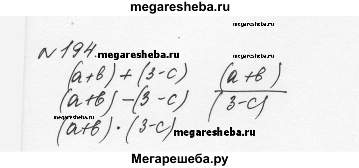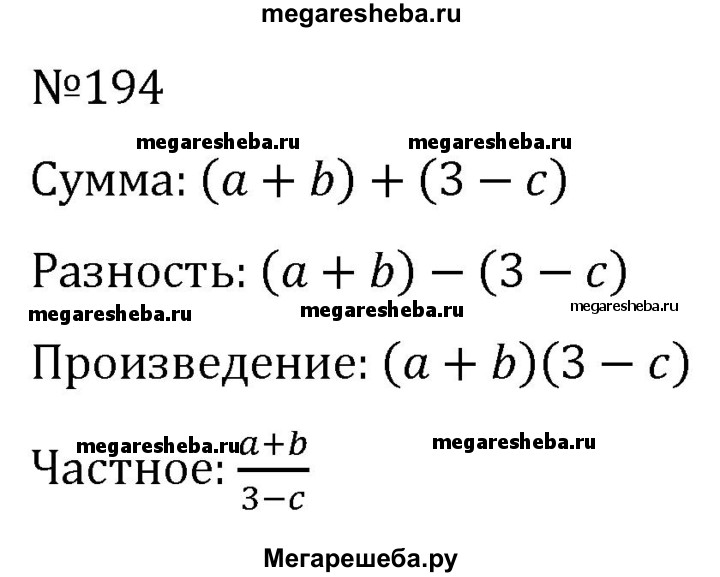 194. Напишите сумму, разность, произведение и частное двух алгебраических выражений (а + b) и (3 - с).