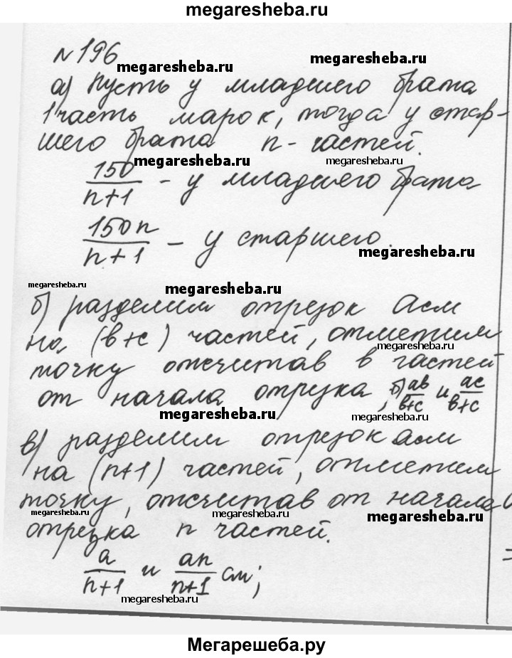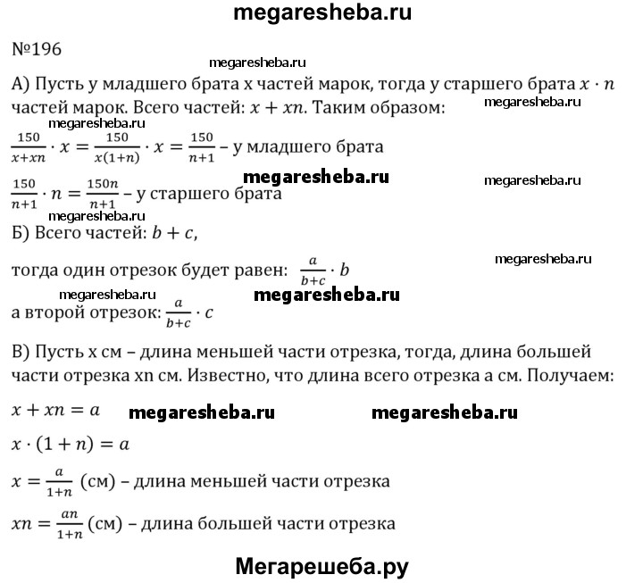 196. а) Два брата коллекционируют почтовые марки. У старшего брата в n раз больше марок, чем у младшего, а всего у них 150 марок. Сколько марок у каждого? б) Разделите отрезок, длина которого а см, в отношении b : с. в) Разделите отрезок, длина которого а см, так, чтобы одна его часть была в n раз больше другой.