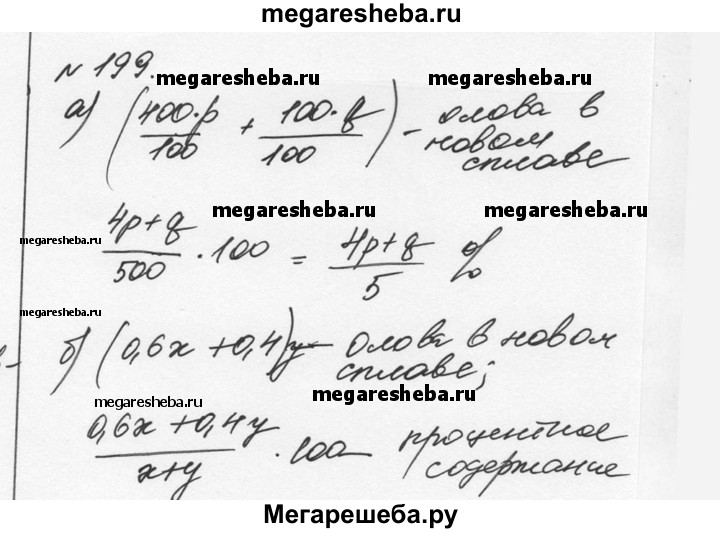 199. а) Первый кусок сплава массой 400 г содержит р% олова, а второй кусок сплава массой 100 г содержит q% олова. Определите процентное содержание олова в новом сплаве, полученном сплавлением этих кусков. б) Первый кусок сплава массой х г содержит 60% олова, а второй кусок сплава массой у г содержит 40% олова. Определите процентное содержание олова в новом сплаве, полученном сплавлением этих кусков.