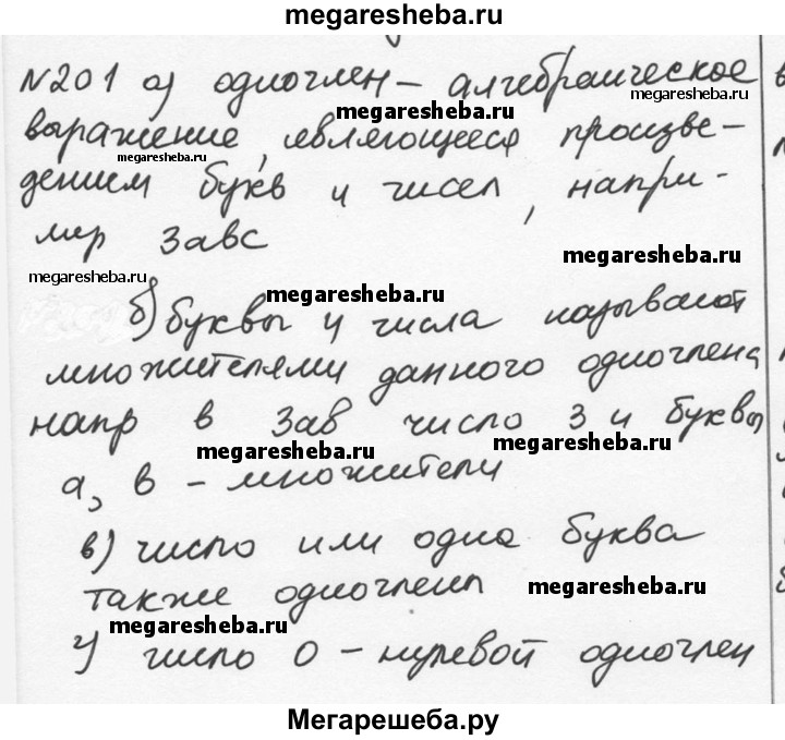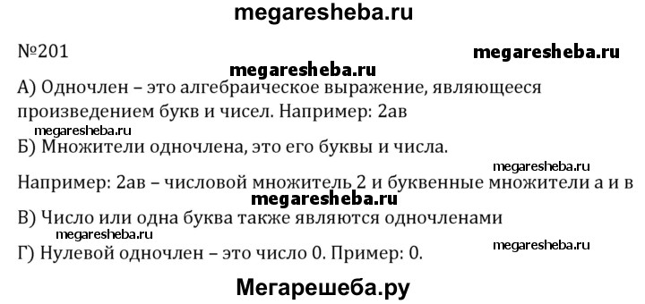 201. а) Что называют одночленом? Приведите примеры. б) Что называют множителями одночлена? Приведите примеры. в) Является ли одночленом число; буква? г) Что называют нулевым одночленом? Приведите примеры.