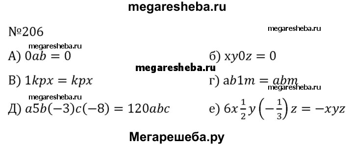 206. Упростите запись одночлена: а) 0ab; б) xy0z; в) 1kpx; г) ab1m; д) a5b(-3)c(-8); е) 6x*1/2*y(-1/3)z.