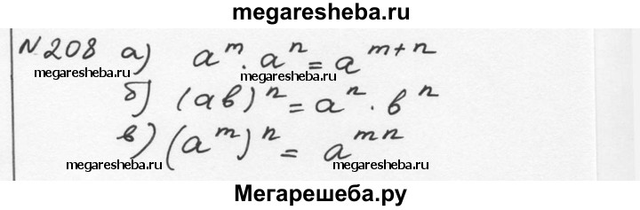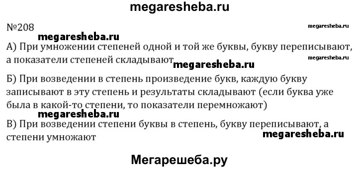208. По какому правилу: а) умножают степени одной и той же буквы; б) возводят в степень произведение букв; в) степень буквы возводят в степень?