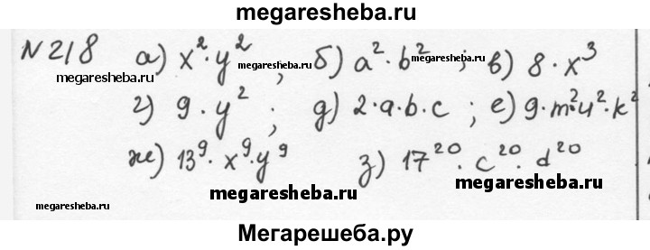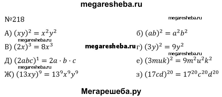 218. Представьте данную степень в виде произведения: а) (xy)^2; б) (ab)^2; в) (2a)^2; г) (3b)^3; д) (2abc)^1; e) (3muk)^2; ж) (13xy)^9; з) (17cd)^20.