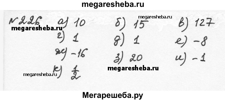 226. Укажите коэффициент одночлена, записанного в стандартном виде: а) 10а; б) 15а^2b; в) 127b^3с^4; г) а; д) се; е) (-8)е^4/е^7; ж) (-16)k^2р; з) 20р^2х^5; и) –х^3у^2; к) 1/2ас.