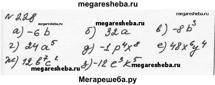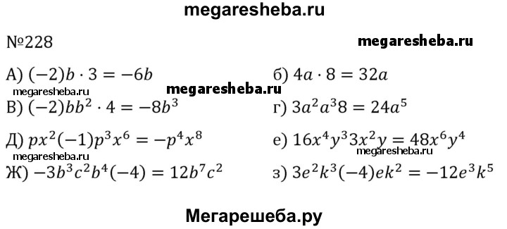 228. Приведите одночлен к стандартному виду: а) (-2)b^3; б) 4а^8; в) (-2)bb^2^4; г) За2а^3^8; д) рх2(-1)р3х6; е) 16x^4y^3^3x^2y; ж) (-3)b^3с^2b^4 (-4); з) 3e^2k^3(-4)ek^2.