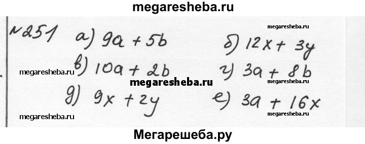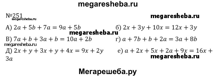 Упростите многочлен (251—253): 251. а) 2а + 5b + 7а; б) 2x + За + 10x; в) 7а + b + За + b; г) а + 7b + b + 2а; д) 2х + у + Зх + у + 4х; е) а + 2x + 5x + 2а + 9x.