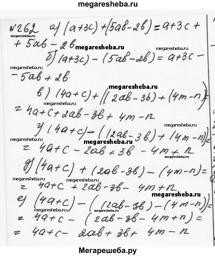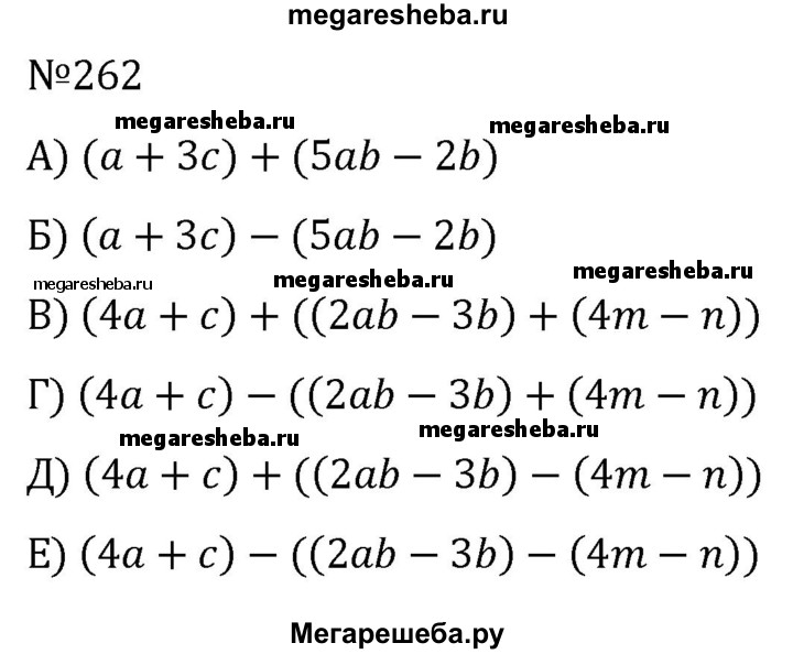 262 Запишите в виде многочлена: а) сумму а + Зс и 5аb - 2b; б) разность а + Зс и 5аb - 2b; в) сумму 4а + с и суммы 2аb - Зb и 4m - n; г) разность 4а + с и суммы 2аb - Зb и 4m - n; д) сумму 4а + с и разности 2аb - Зb и 4m - n; е) разность 4а + с и разности 2аb - Зb и 4m - n.