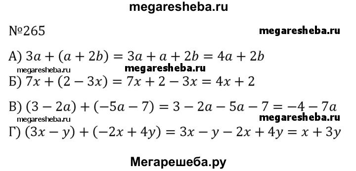265. Найдите многочлен, равный сумме многочленов: а) За и (а + 2b); б) 7х и (2 - Зх); в) (3 - 2а) и (-5а - 7); г) (Зх -у) и (-2х + 4у).