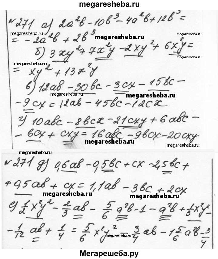 271. Упростите: а) (2а2b - 10b3) - (4а2b - 12b3); б) (3ху2 + 7х2у) - (2ху2 - 6х2у); в) 12аb - 30bс - Зсх - (15bс + 9сх); г) (10аbс - 8bсх - 21сху) - (-6abc + bсх - сху); д) (0,баb - 0,5bс + сх) - (2,5bс - 0,5аb - сх); е) (1/2*x2y2 - 2/3*х2у2 - 5/6*a2b) - (а2b -1/3*х2у2 + 1/12*ab - 1/4).