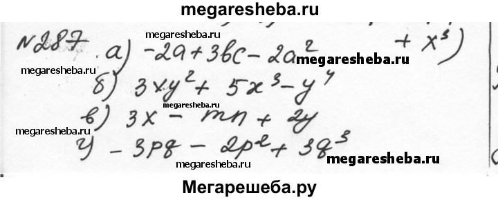 287. Напишите многочлен, противоположный данному: а) 2а – 3bс + 2а^2; б) -3ху^2 - 5х^3 + у4; в) -Зx + mn - 2у; г) 3pq + 2р^2 - 3q^3.