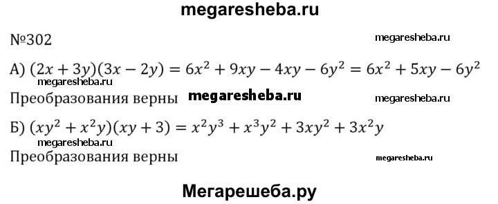 302. Верно ли выполнены преобразования: а) (2х + 3у)(3х - 2у) = 6x2 - 4ху + 9ху - 6у2 = 6х2 + 5ху - 6у2; б) (ху2 + х2у)(ху + 3) = х2у3 + 3ху2 + х3у2 + Зх2у?