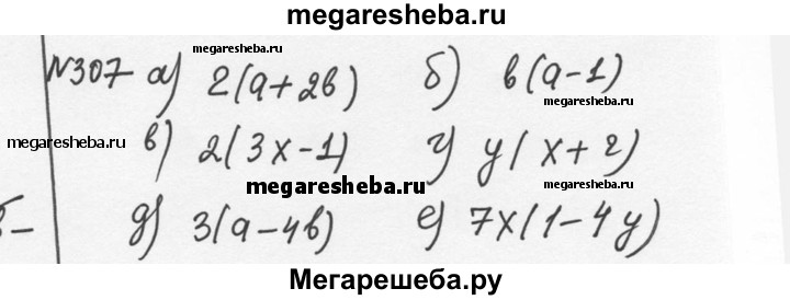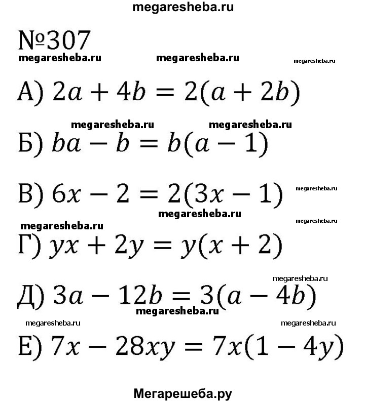 Разложите многочлен на множители (307—308): 307. а) 2а + 4b; б) ba - b; в) 6x - 2; г) ух + 2у; д) За - 12b; е) 7х - 28ху.