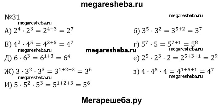 31. Запишите произведение в виде степени: а) 2^4 * 2^3; б) З^5 * З^2; в) 4^2 * 4^5; г) 5^7 * 5; д) 6 * 6^3; е) 2^5 * 2^3 * 2; ж) 3 * З^2 * З^3; з) 4 * 4^5 * 4; и) 5 * 5^2 * 5^3.