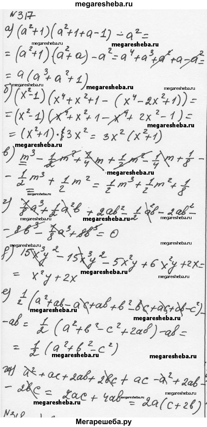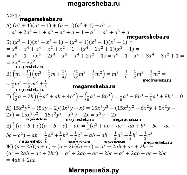 317 а) (а2 + 1)(а2 + 1) + (а - 1)(а2 + 1) - а2; б) (х2 - 1)(х4 + х2 + 1) - (х2 - 1) (х2 - 1) (х2 - 1); в) (m+1/2)(m2-1/2*m+1/4) - (1/2*m3-1/2*m2); г) (1/2*a-2b)(1/3*a4+ab+4b2)-(1/8*a3-8b3); д) 15x3y2 - (5ху - 2)(3x2y + x); е) 1/2(a + b + c)(a + b - c) - ab; ж) (a + 2b) (a + c) - (a - 2b) (a - c).