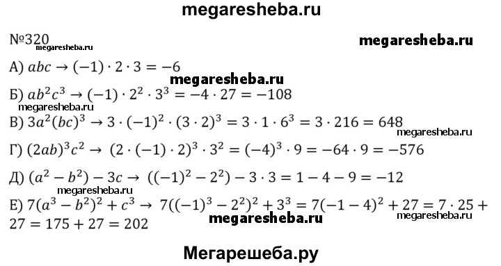 320. Вычислите значение целого выражения: a) abc; б) ab2c3; в) За2 (bс)3; г) (2аb)3с2; д) (а2 - b2) - Зс; е) 7 (а3 - b2)2 + с3 при а = -1, b = 2, с = 3.