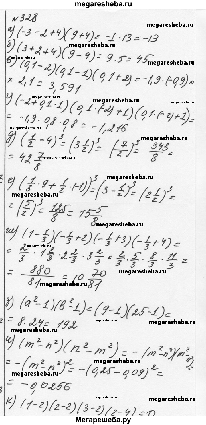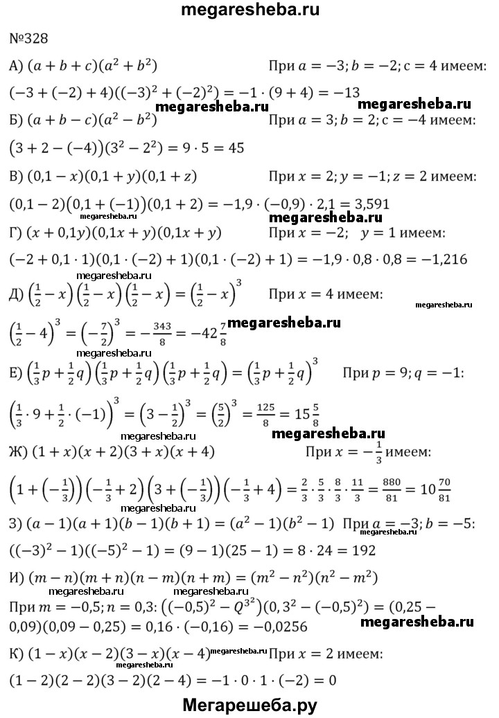 328 а) (а + b + с)(а2 + b2) при а = -3, b = -2, с = 4; б) (а + b - с) (а2 - b2) при а = 3, b = 2, с = -4; в) (0,1 - x)(0,1 + у)(0,1 + z) при х = 2, у = -1, z = 2; г) (х + 0,1y)(0,1x + y)(0,1x + у) при х = -2, у = 1; д) (1/2-x)(1/2-x)(1/2-x) при x=4; е) (1/3*p+1/2*q)(1/3*p+1/2*q)(1/3*p+1/2*q) при p=9, q=-1; ж) (1 + x)(x + 2)(3 + x)(x + 4) при х = -1/3; з) (а - 1)(а + 1)(b - 1)(b + 1) при а = -3, b = -5; и) (m - n)(m + n)(n - m)(n + m) при m = -0,5, n = 0,3; к) (1 - х)(х - 2)(3 - x)(x - 4) при х = 2.