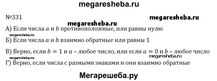 331. Укажите все значения а и b, для которых верно равенство: а) а + b = 0; б) а • b = 1; в) а • b = а; г) а • b = -1.