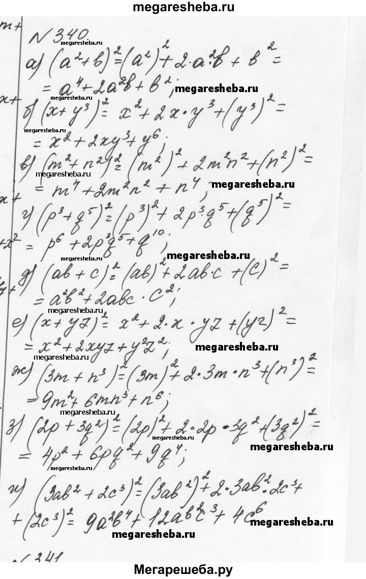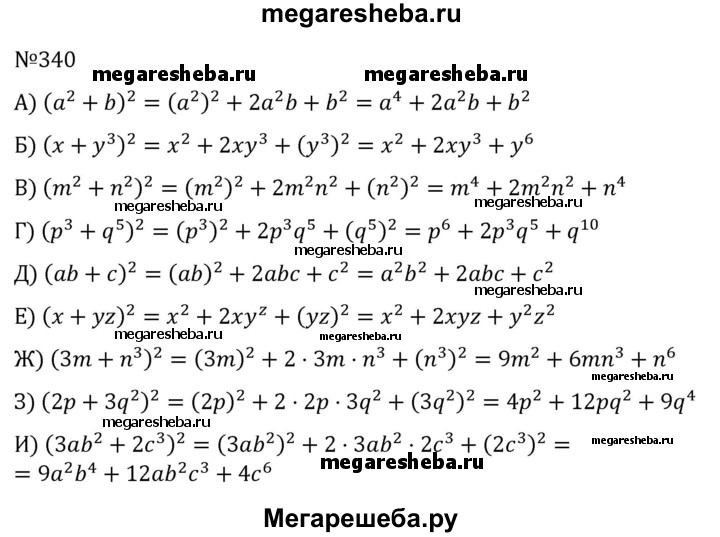 340. Используя формулу квадрата суммы, преобразуйте выражение в многочлен стандартного вида: а) (а^2 + b)^2; б) (х + у^3)^2; в) (m^2 + n^2)^2; г) (р^3 + q^5)^2; д) (ab + с)^2; е) (х + уz)^2;