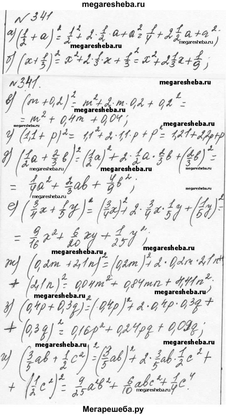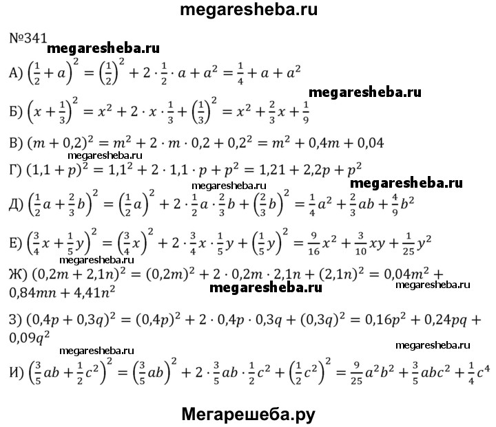 341 Преобразуйте выражение в многочлен: а) (1/2 + a)2; б) (x+1/3)2; в) (m+0,2)2; г) (1,1+p)2; д) (1/2*a+2/3*b)2; е) (3/4*x+1/5*y)2; ж) (0,2m+2,1n)2; з) (0,4p+9,3q)2; и) (3/5*ab + 1/2*c2)2.
