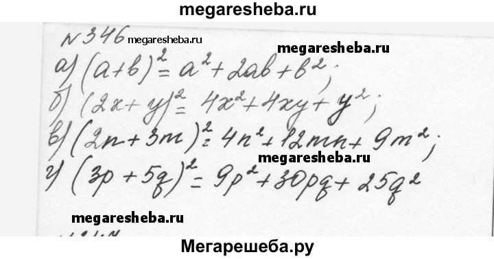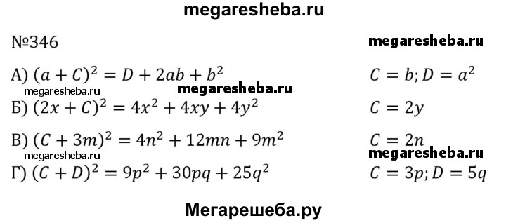 346 Вместо букв С и D подберите одночлены так, чтобы выполнялось равенство: а) (а + С)2 = D + 2аb + b2; б) (2x + С)2 = 4х2 + 4ху + у2; в) (С + Зm)2 = 4а2 + 12mn + 9m2; г) (С + D)2 = 9р2 + 30pq + 25q2.