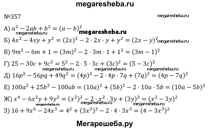 357. Представьте многочлен в виде квадрата разности: а) a^2-2ab + b^2; б) 4х^2 - 4ху + у^2; в) 9m^2 – 6m + 1; г) 25 - 30с + 9с^2; д) 16р^2 - 56pq + 49q^2; е) 100a^2 + 25b^2 - 100ab; ж) x^4 – 6x^2y + 9у^2; з) 16 + 9х^6 – 24x^3.
