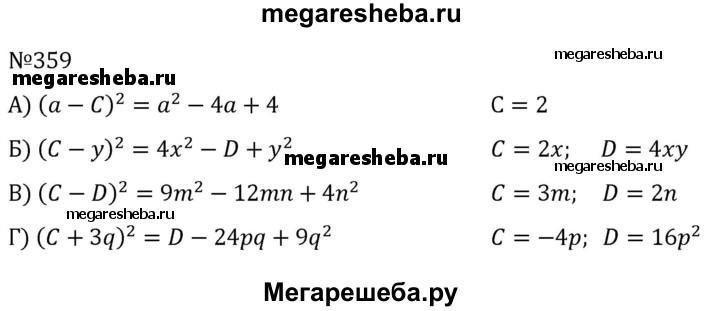 359. Вместо букв С и D подберите одночлены так, чтобы выполнялось равенство: а) (а - С)^2 = а^2 -4а + 4; б) (С - у)^2 = 4х^2 - D + у^2; в) (С - D)^2 = 9m^2 - 12mn + 4n^2; г) (С + 3q)^2 = D - 24pq + 9q^2.