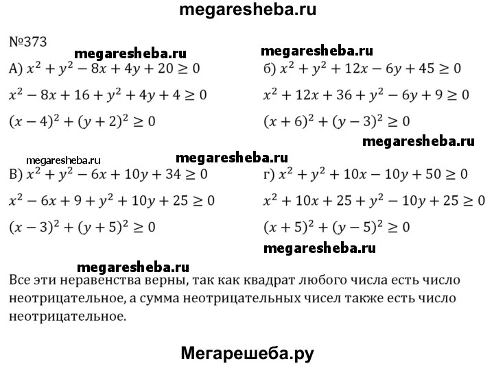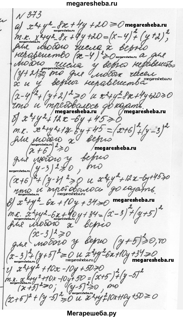 373. Докажите, что для любых чисел х и у верно неравенство: а) х^2 + у^2 - 8х + 4у + 20 ≥ 0; б) х^2 + у^2 + 12х - 6у + 45 ≥ 0; в) х^2 + у^2 — 6х + 10у + 34≥0; г) х^2 + у^2 + 10х - 10у + 50 ≥ 0.