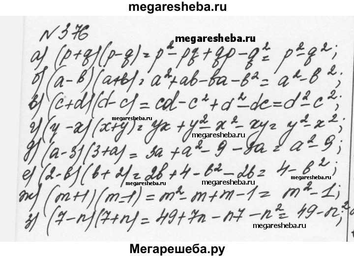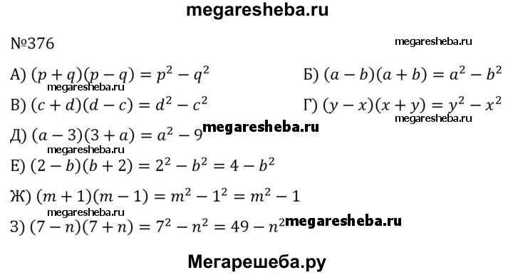 376. Представьте выражение в виде многочлена двумя способами: а) (p + q)(p-q); б) (а-b)(а + b); в) (с + d)(d - с); г) (у - х)(х + у); д) (а - 3)(3 + а); е) (2 - b) (b + 2); ж) (m + 1 )(m - 1); з) (7 - n)(7 + n).