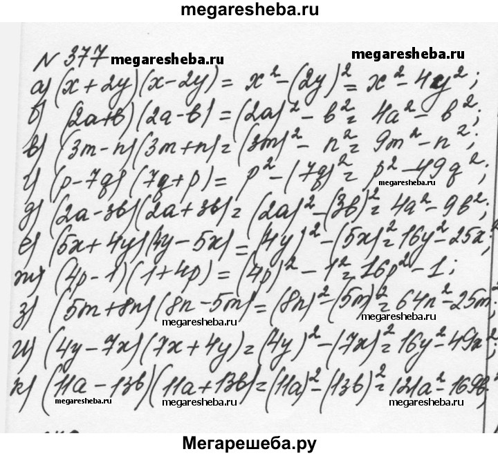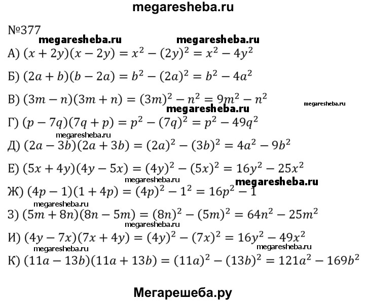 377. Упростите выражение, используя формулу разности квадратов. Сначала представьте выражение в виде разности квадратов, затем упростите запись степени. Например: (За – 2b) (За + 2b) = (За)^2 - (2b)^2 = 9а^2 – 4b^2. а) (х + 2у)(х - 2у); б) (2а + 6) (2а - 6); в) (3m-n)(3m + n); г) (р - 7q)(7q + р); д) (2а – 3b) (2а + 3b); е) (5х + 4у)(4у - 5х); ж) (4р - 1)(1 + 4р); з) (5m + 8n)(8n – 5m); и) (4у - 7х)(7х + 4у); к) (11а – 13b)(11а + 13b).