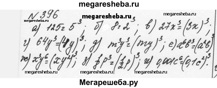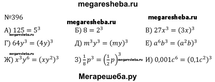 396. Представьте выражение в виде степени с показателем 3: а) 125; б) 8; в) 27х^3; г) 64у^3; д) m^3у^3; е) а^6b^3; ж) х^3у^6; з) 1р^3; и) 0,001с^6.